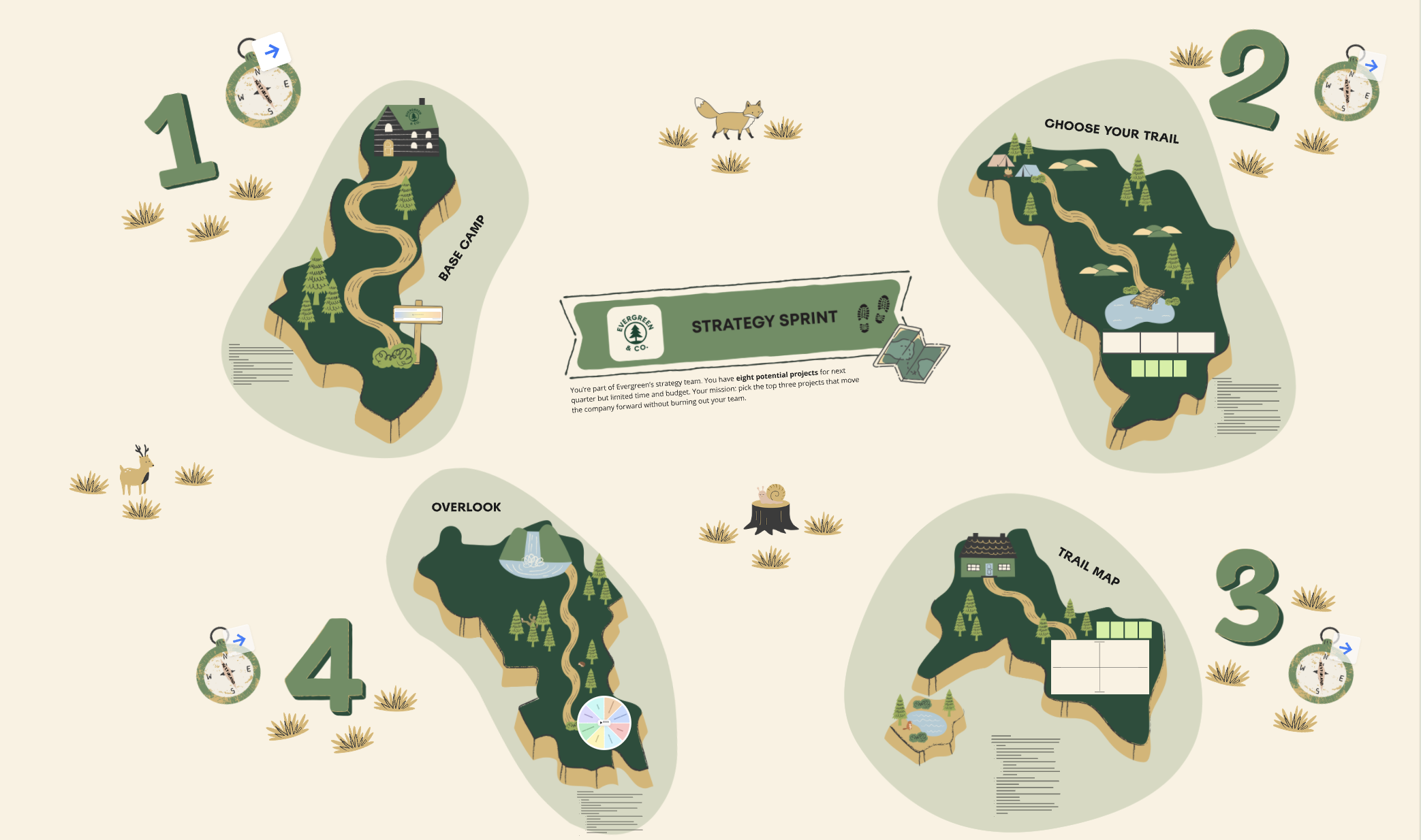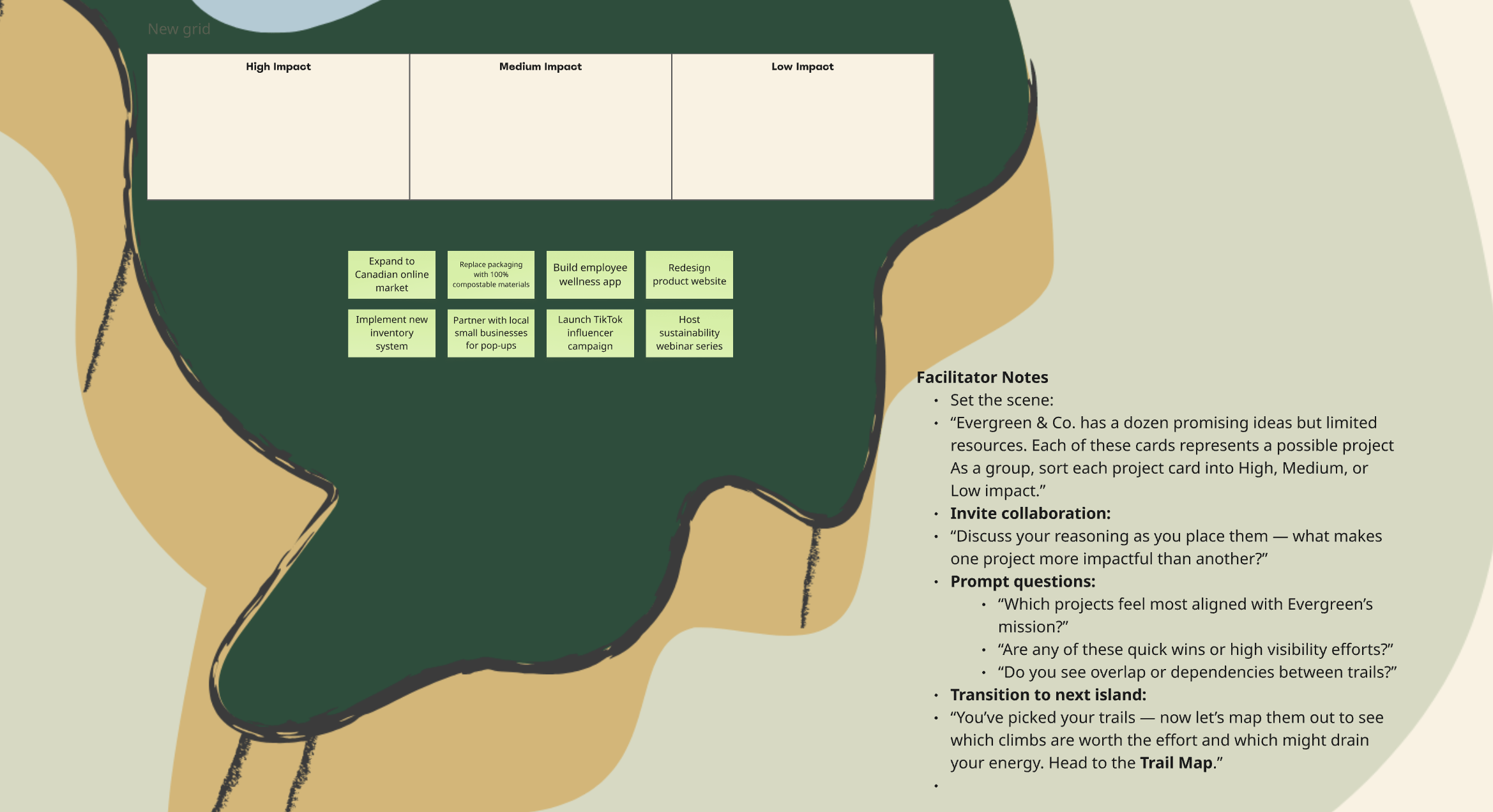 I used a journey-based metaphor β a trail map that guides teams through βislandsβ of learning and decision-making. Each island represents a key milestone in the strategy process (like prioritizing projects, evaluating trade-offs, or aligning goals).